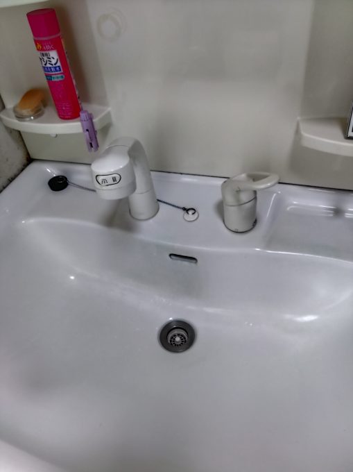 洗面所の蛇口から水が漏れ、レバーも固くて使いづらいとのご相談、ご依頼をいただきお伺いいたしました。