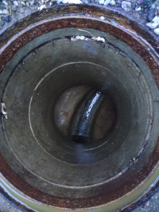 お伺いし、まずは屋外の排水マスを1つ1つ確認すると、どこも水がパンパンに溜まってました。